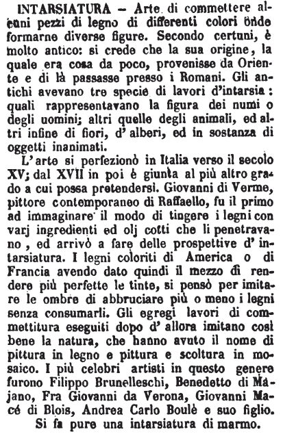 | Intarsiatura - Arte di commettere alcuni pezzi di legno di differenti colori onde formarne diverse figure. Secondo certuni, è molto antico: si crede che la sua origine, la quale era cosa da poco, provenisse da Oriente e di là passasse presso i Romani. Gli antichi avevano tre specie di lavori d'intarsia: quali rappresentavano la figura dei numi o degli uomini; altri quelle degli animali, ed altri infine di fiori, d'alberi, ed in sostanza di oggetti inanimati.