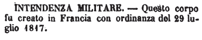 | Intendenza militare - Questo corpo fu creato in Francia con ordinanza del 29 luglio 1817. [immagine] |