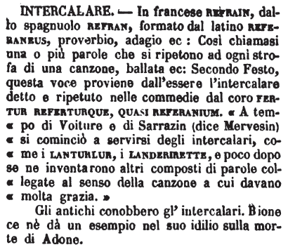 | Intercalare - In francese refrain, dallo spagnuolo refran, formato dal latino referaneus, proverbio, adagio ec: Così chiamasi una o più parole che si ripetono ad ogni strofa di una canzone, ballata ec: Secondo Festo, questa voce proviene dall’essere l’intercalare detto e ripetuto nelle commedie dal coro fertur referturque, quasi referanium. «A tempo di Voiture e di Sarrazin (dice Mervesin) si cominciò a servirsi degli intercalari, come i lanturlur, i landerirette, e poco dopo se ne inventarono altri composti di parole collegate al senso della canzone a cui davano molta grazia.»