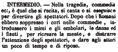 | Intermedio - Nella tragedia, commedia ec:, è quel che si recita, si canta o si eseguisce per divertire gli spettatori. Dopo che i Romani ebbero sopresso i cori nelle commedie, introdussero i mimi e gli embolari, le danze ed i flauti, per ricreare la mente, e distrarre l'attenzione degli spettatori, e dare agli attori un poco di tempo e di riposo. [immagine] |