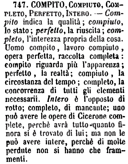 | Compito, Compiuto, Completo, Perfetto, Intero - Compito indica la qualità; compiuto, lo stato; perfetto, la riuscita; completo, l'interezza propria della cosa. Uomo compito, lavoro compiuto, opera perfetta, raccolta completa: compito riguarda più l'apparenza; perfetto, la realtà; compiuto, la circostanza del tempo; completo, la concorrenza di tutti gli elementi necessarii. Intero è l'opposto di rotto; completo, di mancante; uno può avere le opere di Cicerone complete, perchè avrà tutto quanto finora si è trovato di lui; ma non le può avere intere, perchè di molte perdute non si hanno che frammenti. [immagine] |