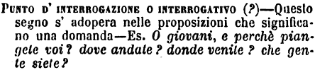 | Punto d’interrogazione o interrogativo (?) - Questo segno s'adopera nelle proposizioni che significano una domanda - Es. O giovani, e perchè piangete voi? dove andate? donde venite? che gente siete? [immagine] |