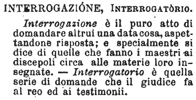 | Interrogazione, Interrogatorio - Interrogazione è il puro atto di domandare altrui una data cosa, aspettandone risposta; e specialmente si dice di quelle che fanno i maestri ai discepoli circa alle materie loro insegnate. - Interrogatorio è quella serie di domande che il giudice fa al reo ed ai testimonii. [immagine] |