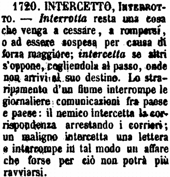 | Intercetto, Interrotto - Interrotta resta una cosa che venga a cessare, a rompersi, o ad essere sospesa per causa di forza maggiore; intercetta se altri s'oppone, cogliendola al passo, onde non arrivi al suo destino. Lo straripamento d'un fiume interrompe le giornaliere comunicazioni fra paese e paese: il nemico intercetta la corrispondenza arrestando i corrieri; un maligno intercetta una lettera e interrompe in tal modo un affare che forse per ciò non potrà più ravviarsi. [immagine] |
