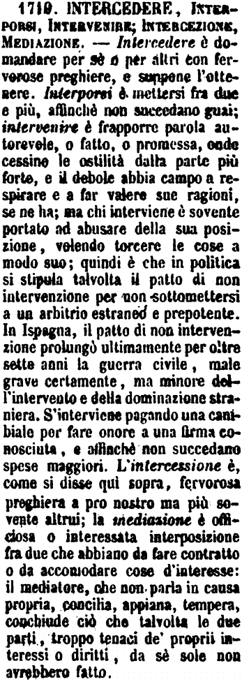 | Intercedere, Interporsi, Intervenire; Intercezione, Mediazione - Intercedere è domandare per sè o per altri con fervorose preghiere, e suppone l'ottenere. Interporsi è mettersi fra due e più, affinchè non succedano guai; intervenire è frapporre parola autorevole, o fatto, o promessa, onde cessino le ostilità dalla parte più forte, e il debole abbia campo a respirare e a far valere sue ragioni, se ne ha; ma chi interviene è sovente portato ad abusare della sua posizione, volendo torcere le cose a modo suo; quindi è che in politica si stipula talvolta il patto di non intervenzione per non sottomettersi a un arbitrio estraneo e prepotente. In Ispagna, il patto di non intervenzione prolungò ultimamente per oltre sette anni la guerra civile, male grave certamente, ma minore dell'intervento e della dominazione straniera. S'interviene pagando una cambiale per fare onore a una firma conosciuta, e affinché non succedano spese maggiori. L'intercessione è, come si disse qui sopra, fervorosa preghiera a pro nostro ma più sovente altrui; la mediazione è officiosa o interessata interposizione fra due che abbiano da fare contratto o da accomodare cose d'interesse: il mediatore, che non parla in causa propria, concilia, appiana, tempera, conchiude ciò che talvolta le due parti, troppo tenaci de' proprii interessi o diritti, da sè sole non avrebbero fatto. [immagine] |