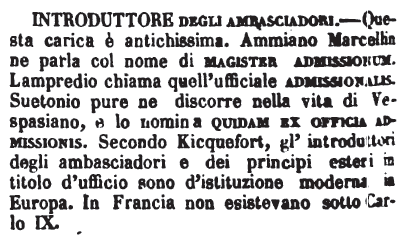 | Introduttore degli ambasciadori - Questa carica è antichissima. Ammiano Marcellin ne parla col nome di magister admissionum. Lampredio chiama quell'ufficiale admissionalis. Suetonio pure ne discorre nella vita di Vespasiano, e lo nomina quidam ex officia admissionis. Secondo Kicquefort, gl'introduttori degli ambasciadori e dei principi esteri in titolo d'ufficio sono d'istituzione moderna in Europa. In Francia non esistevano sotto Carlo IX. [immagine] |