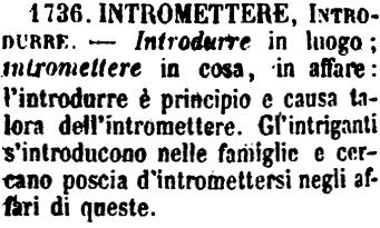 | Intromettere, Introdurre - Introdurre in luogo; intromettere in cosa, in affare: l'introdurre è principio e causa talora dell'intromettere. Gl'intriganti s'introducono nelle famiglie e cercano poscia d'intromettersi negli affari di queste. [immagine] |