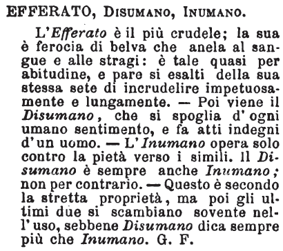 | Efferato, Disumano, Inumano - L'Efferato è il più crudele; la sua è ferocia di belva che anela al sangue e alle stragi: è tale quasi per abitudine, e pare si esalti della sua stessa sete di incrudelire impetuosamente e lungamente. - Poi viene il Disumano, che si spoglia d'ogni umano sentimento, e fa atti indegni d'un uomo. - L'Inumano opera solo contro la pietà verso i simili. Il Disumano è sempre anche Inumano; non per contrario. - Questo è secondo la stretta proprietà, ma poi gli ultimi due si scambiano sovente nell'uso, sebbene Disumano dica sempre più che Inumano. G. F. [immagine] |