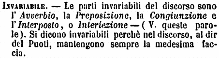 | Invariabile - Le parti invariabili del discorso sono l'Avverbio, la Preposizione, la Congiunzione e l'Interposto, o Interiezione - (V. queste parole). Si dicono invariabili perché nel discorso, al dir del Puoti, mantengono sempre la medesima faccia. [immagine] |