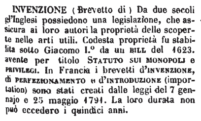 | Invenzione (Brevetto di) - Da due secoli gl'Inglesi possiedono una legislazione, che assicura ai loro autori la proprietà delle scoperte nelle arti utili. Codesta proprietà fu stabilita sotto Giacomo I.° da un bill del 1623. avente per titolo Statuto sui monopolj e privilegi. In Francia i brevetti d'invenzione, di perfezionamento e d'introduzione (importation) sono stati creati dalle leggi del 7 gennajo e 25 maggio 1791. La loro durata non può eccedere i quindici anni. [immagine] |