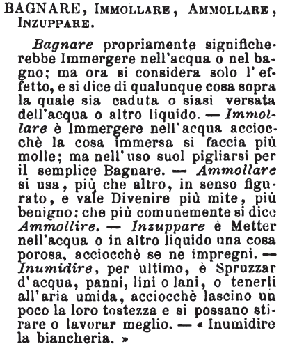 | Bagnare, Immolare, Ammollare, Inzuppare - Bagnare propriamente significherebbe Immergere nell'acqua o nel bagno; ma ora si considera solo l'effetto, e si dice di qualunque cosa sopra la quale sia caduta o siasi versata dell'acqua o altro liquido. - Immollare è Immergere nell'acqua acciocchè la cosa immersa si faccia più molle; ma nell'uso suol pigliarsi per il semplice Bagnare. - Ammollare si usa, più che altro, in senso figurato, e vale Divenire più mite, più benigno; che più comunemente si dice Ammollire. - Inzuppare è Metter nell'acqua o in altro liquido una cosa porosa, acciocchè se ne impregni. - Inumidire, per ultimo, è Spruzzar d'acqua, panni, lini o lani, o tenerli all'aria umida, acciocchè lascino un poco la loro tostezza e si possano stirare o lavorar meglio. - «Inumidire la biancheria.» [immagine] |