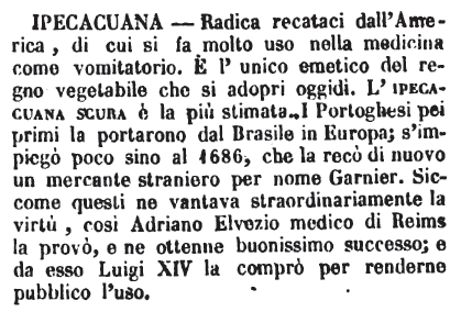 | Ipecacuana - Radica recataci dall'America, di cui si fa molto uso nella medicina come vomitatorio. È l'unico emetico del regno vegetabile che si adopri oggidì. L'ipecacuana scura è la più stimata. I Portoghesi pei primi la portarono dal Brasile in Europa; s'impiegò poco sino al 1686, che la recò di nuovo un mercante straniero per nome Garnier. Siccome questi ne vantava straordinariamente la virtù, così Adriano Elvezio medico di Reims la provò, e ne ottenne buonissimo successo; e da esso Luigi XIV la comprò per renderne pubblico l'uso. [immagine] |