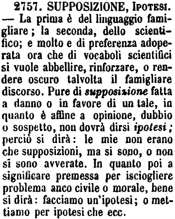 | Supposizione, Ipotesi - La prima è del linguaggio famigliare; la seconda, dello scientifico; e molto e di preferenza adoperata ora che di vocaboli scientifici si vuole abbellire, rinforzare, o rendere oscuro talvolta il famigliare discorso. Pure di supposizione fatta a danno o in favore di un tale, in quanto è affine a opinione, dubbio o sospetto, non dovrà dirsi ipotesi; perciò si dirà: le mie non erano che supposizioni, ma si sono, o non si sono avverate. In quanto poi a significare premessa per isciogliere problema anco civile o morale, bene si dirà: facciamo un'ipotesi; o mettiamo per ipotesi che ecc. [immagine] |