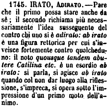 | Irato, Adirato - Pare che il primo possa stare anche da sè; il secondo richiama più necessariamente l'idea susseguente del contro chi uno si è adirato: ab irato è una figura rettorica per cui s'inveisce fortemente contro qualcheduno: il noto quousque tandem abutere Catilina etc. è un esordio ab irato: si parla, si agisce ab irato quando col non dar luogo alla riflessione, s'impreca, si opera sotto l'impressione d'un primo moto dell'animo. [immagine] |