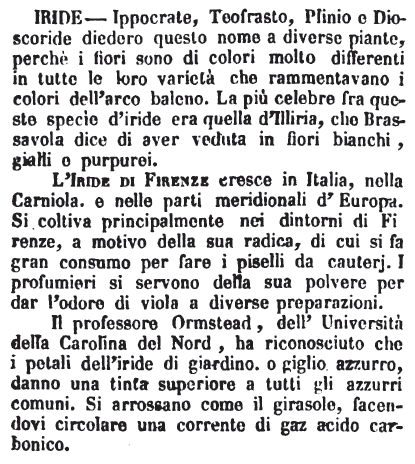 L'Iride di Firenze cresce in Italia, nella Carniola. e nelle parti meridionali d'Europa. Si coltiva principalmente nei dintorni di Firenze, a motivo della sua radica, di cui si fa gran consumo per fare i piselli da cauterj. I profumieri si servono della sua polvere per dar l'odore di viola a diverse preparazioni. Il professore Ormstead, dell'Università della Carolina del Nord, ha riconosciuto che i petali dell'iride di giardino. o giglio azzurro, danno una tinta superiore a tutti gli azzurri comuni. Si arrossano come il girasole, facendovi circolare una corrente di gaz acido carbonico. [immagine] |