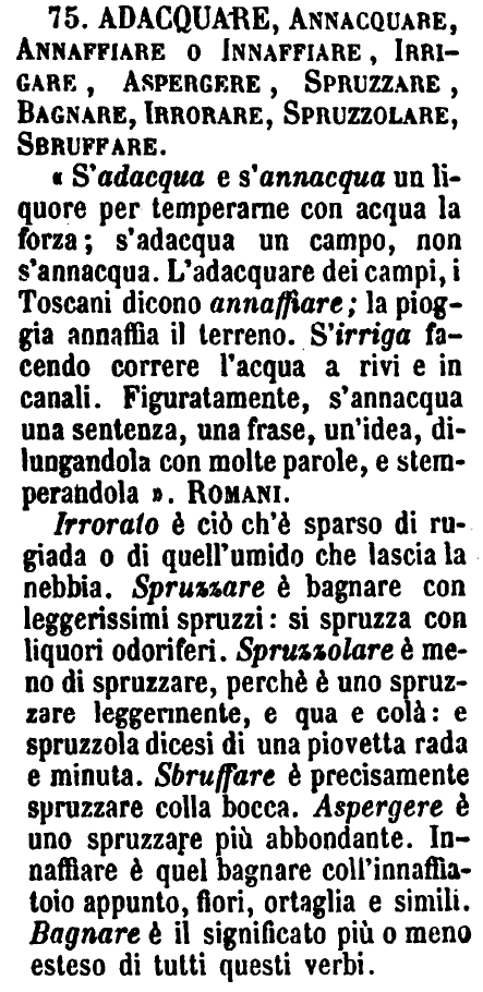 Adacquare, Annacquare, Annaffiare o Innaffiare, Irrigare, Aspergere, Spruzzare, Bagnare, Irrorare, Spruzzolare, Sbruffare - « S'adacqua e s'annacqua un liquore per temperarne con acqua la forza; s'adacqua un campo, non s'annacqua. L'adacquare dei campi, i Toscani dicono annaffiare; la pioggia annaffia il terreno. S'irriga facendo correre l'acqua a rivi e in canali. Figuratamente, s'annacqua una sentenza, una frase, un'idea, dilungandola con molte parole, e stemperandola ». Romani.