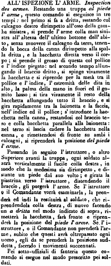 | All'ispezione l'arme - Inspection des armes. Restando una truppa al piede l'arme, questo comando si eseguisce in tre tempi: nel primo si fa a dritta, restando col calcagno destro dirimpetto all'osso della gamba sinistra, si prende l'arme colla man sinistra all'altezza dell'ultimo bottone dell'abito, senza muovere il calcagno da terra, tenendo la bocca della canna dirimpetto alla spalla dritta, e la bacchetta diretta verso il corpo; si prende il grosso di questa col pollice e l'indice piegato: nel secondo tempo allungando il braccio dritto, si spinge vivamente la bacchetta e si riprende per la metà tra il pollice e l'indice, l'estremità delle dita in alto, la palma della mano in fuori ed il gomito basso; si tira vivamente il resto della bacchetta allungando tutto il braccio, e si gira rapidamente tra la baionetta e la faccia, nell'indice ed il pollice; s'introduce la bacchetta nella canna, restandosi col braccio teso e colla bacchetta parallela alla baionetta: nel terzo si lascia cadere la bacchetta nella canna, e rimettendosi di fronte su ambi i calcagni, si riprenderà la posizione del piede l'arme.