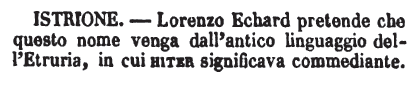 | Istrione - Lorenzo Echard pretende che questo nome venga dall'antico linguaggio dell'Etruria, in cui hiter significava commediante. [immagine] |