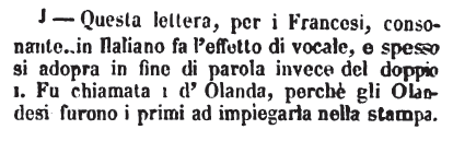 | J - Questa lettera, per i Francesi, consonante, in Italiano fa l'effetto di vocale, e spesso si adopra in fine di parola invece del doppio i. Fu chiamata i d'Olanda, perchè gli Olandesi furono i primi ad impiegarla nella stampa. [immagine] |