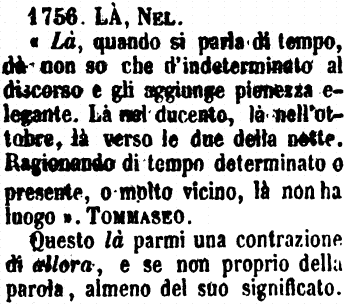 Là, Nel - «Là, quando si parla di tempo, dà non so che d'indeterminato al discorso e gli aggiunge pienezza elegante. Là nel ducento, là nell'ottobre, là verso le due della notte. Ragionando di tempo determinato o presente, o molto vicino, là non ha luogo». Tommaseo.