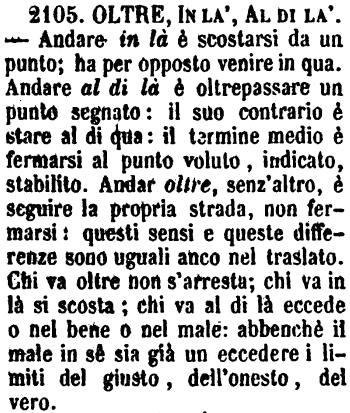 | Oltre, In là, Al di là - Andare in là è scostarsi da un punto; ha per opposto venire in qua. Andare al di là è oltrepassare un punto segnato: il suo contrario è stare al di qua: il termine medio è fermarsi al punto voluto, indicato, stabilito. Andar oltre, senz'altro, è seguire la propria strada, non fermarsi: questi sensi e queste differenze sono uguali anco nel traslato. Chi va oltre non s'arresta; chi va in là si scosta; chi va al di là eccede o nel bene o nel male: abbenchè il male in sè sia già un eccedere i limiti del giusto, dell'onesto, del vero. [immagine] |