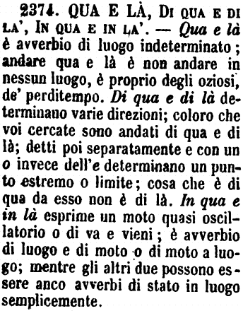 | Qua e là, Di qua e di là, In qua e in là - Qua e là è avverbio di luogo indeterminato; andare qua e là è non andare in nessun luogo, è proprio degli oziosi, de' perditempo. Di qua e di là determinano varie direzioni; coloro che voi cercate sono andati di qua e di là; detti poi separatamente e con un o invece dell'e determinano un punto estremo o limite; cosa che è di qua da esso non è di là. In qua e in là esprime un moto quasi oscillatorio o di va e vieni; è avverbio di luogo e di moto o di moto a luogo; mentre gli altri due possono essere anco avverbi di stato in luogo semplicemente. [immagine] |