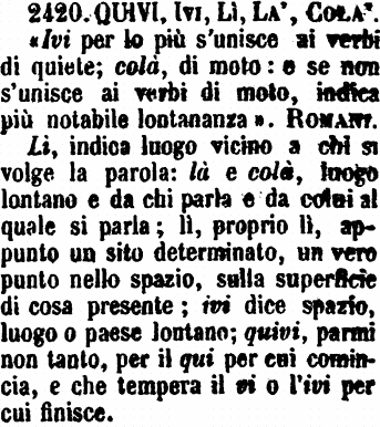 Lì, indica luogo vicino a chi si volge la parola: là e colà, luogo lontano e da chi parla e da colui al quale si parla; lì, proprio lì, appunto un sito determinato, un vero punto nello spazio, sulla superficie di cosa presente; ivi dice spazio, luogo o paese lontano; quivi, parmi non tanto, per il qui per cui comincia, e che tempera il vi o l'ivi per cui finisce. [immagine] |