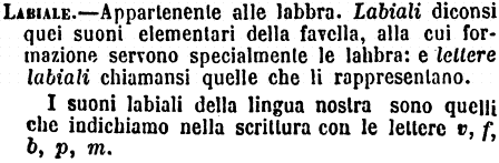Labiale - Appartenente alle labbra. Labiali diconsi quei suoni elementari della favella, alla cui formazione servono specialmente le labbra: e lettere labiali chiamansi quelle che li rappresentano.