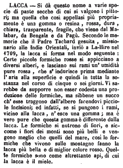 | Lacca - Si dà questo nome a varie specie di paste secche di cui si valgono i pittori; ma quella che così appellasi più propriamente è una gomma o resina, rossa, dura, chiara, trasperente, fragile, che viene dal Malabar, da Bengala e da Pagù. Secondo le memorie che il Padre Tachard gesuita, missionario alle Indie Orientali, inviò a La-Hire nel 1709, la lacca si forma nel modo seguente: Certe piccole formiche rosse si appicciano a diversi alberi, e lasciano sui rami un'umidità pure rossa, che s'indurisce prima mediante l'aria alla superficie e quindi in tutta la sostanza nel corso di cinque o sei giorni. Vi sarebbe da supporre non esser codesta una produzione delle formiche, ma sibbene un succo ch'esse traggono dall'albero facendovi picciole incisioni; ed infatti, se si pungono i rami, vicino alla lacca, n'esce una gomma; ma è vero pure che questa gomma è differente dalla lacca. Le formiche si nutrono di fiori, e siccome i fiori dei monti sono più belli e vengono meglio che quelli del mare, così le formiche che vivono sulle montagne fanno la lacca più bella e di miglior colore rosso. Quelle formiche sono come altrettante api, di cui la lacca è il miele. [immagine] |