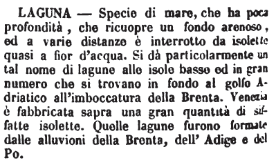 [Cont.] Gugl. Nat. fiumi, I. 55. Le lagune poi sono fatte dalle acque marine separate dal mare col mezzo degli scanni o staggi d'arena. T. Le lagune venete; Ass. per antonom. Venezia, la città delle lagune. – I prodi figli delle lagune, gli antichi Veneziani. 2. Spazio vôto in cosa che dovrebbe essere andantemente ripiena. Magal. Lett. 16. (Mt.) A volere che con l'uso non ricascasse, e non facesse come fa l'ovatta di gran lagune, l'impuntura dovrebbe essere fittissima. 5. Laguna vale anche Interruzione, Vôto nel testo di un autore, o nel corpo d'un'opera. Salvin. Annot. Mur. 2. 85. (M.) Nella lettera dedicatoria… il pubblicatore di questi frammenti, che riempiono le lagune di Petronio, dice… Gor. Long. (Mt.) Io credo che nell'originaie greco sia in questo luogo qualche scorrezione o laguna. Magal. Lett. Se a sorte l'avessi scritta nella laguna che lasciai ne' fogli, e che Paolo si è ritenuti. V. anche LACUNA. |