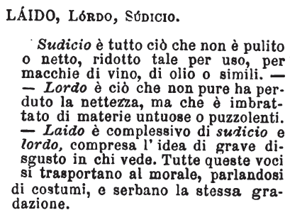 | Laido, Lordo, Sudicio - Sudicio è tutto ciò che non è pulito o netto, ridotto tale per uso, per macchie di vino, di olio o simili. - Lordo è ciò che non pure ha perduto la nettezza, ma che è imbrattato di materie untuose o puzzolenti. - Laido è complessivo di sudicio e lordo, compresa l'idea di grave disgusto in chi vede. Tutte queste voci si trasportano al morale, parlandosi di costumi, e serbano la stessa gradazione. [immagine] |