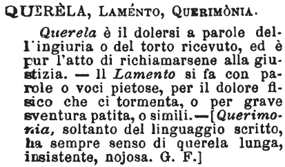 | Querela, Lamento, Querimonia - Querela è il dolersi a parole dell'ingiuria o del torto ricevuto, ed è pur l'atto di richiamarsene alla giustizia. - Il Lamento si fa con parole o voci pietose, per il dolore fisico che ci tormenta, o per grave sventura patita, o simili. - [Querimonia, soltanto del linguaggio scritto, ha sempre senso di querela lunga, insistente, nojosa. G.F.] [immagine] |