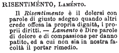 | Risentimento, Lamento - Il Risentimento è il dolersi con parole di giusto sdegno quando altri crede offesa la propria dignità, i proprii diritti. - Lamento è Dire parole di dolore e di compassione per danno patito, ed a cui non sia in nostra facoltà il portar rimedio. [immagine] |