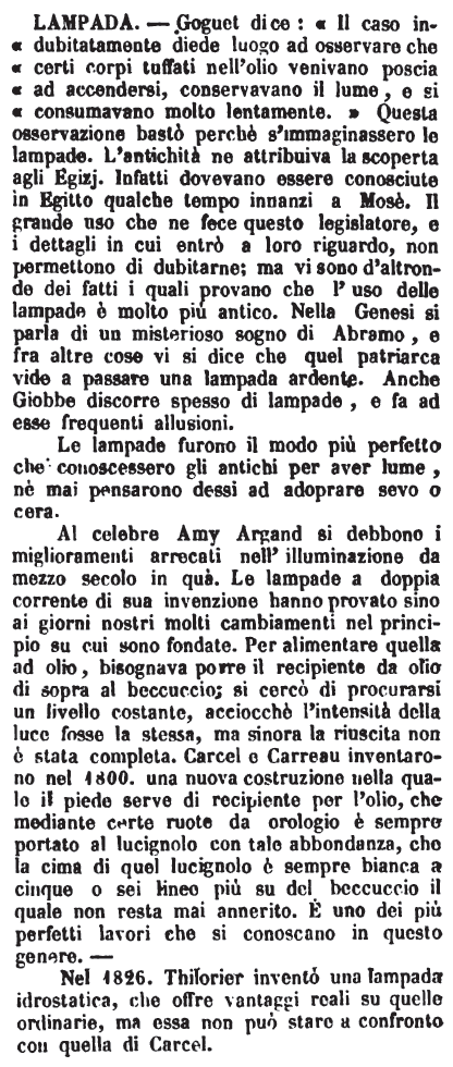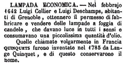 | Lampada economica - Nel febbrajo 1642 Luigi Collier e Luigi Deschamps, abitanti di Grenoble, ottennero il permesso di fabbricare e vendere delle lampade a foggia di candele, che davano luce in tutti i sensi e consumavano una piccolissima quantità d'olio.