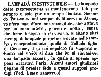 | Lampada inestinguibile - Le lampade dette inestinguibili si mantenevano tali per sempre o solo per un tempo limitato. Secondo Pausania, nel tempio di Minerva in Atene, ve n'era una d'oro non spengibile, che ardeva per un anno intero, giorno e notte, senza che fosse bisogno di ravvivarla. Si citano altri esempj di lampade perpetue trovate nelle tombe, e segnatamente quella di Tulliola figlia di Cicerone, il di cui sepolcro fu scoperto in Roma nel 1540; si dice che ivi si rinvenisse una lampada accesa, la quale si spense appena entratavi l'aria. Alcuni autori giudiziosi negano di prestar fede a questi supposti prodigi (Ved. Lume perpetuo) [immagine] |