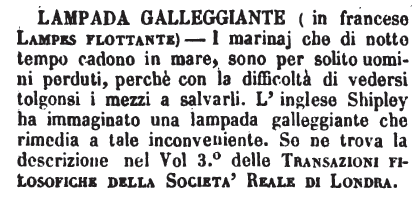 | Lampada galleggiante - (in francese Lampes flottante) - I marinaj che di notte tempo cadono in mare, sono per solito uomini perduti, perchè con la difficoltà di vedersi tolgonsi i mezzi a salvarli. L'inglese Shipley ha immaginato una lampada galleggiante che rimedia a tale inconveniente. Se ne trova la descrizione nel Vol 3.° delle Transazioni filosofiche della Società Reale di Londra. [immagine] |