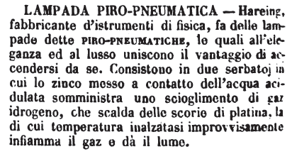 | Lampada piro-pneumatica - Hareing, fabbricante d'istrumenti di fisica, fa delle lampade dette piro-pneumatiche, le quali all'eleganza ed al lusso uniscono il vantaggio di accendersi da se. Consistono in due serbatoj in cui lo zinco messo a contatto dell'acqua acidulata somministra uno scioglimento di gaz idrogeno, che scalda delle scorie di platina, la di cui temperatura inalzatasi improvvisamente infiamma il gaz e dà il lume. [immagine] |