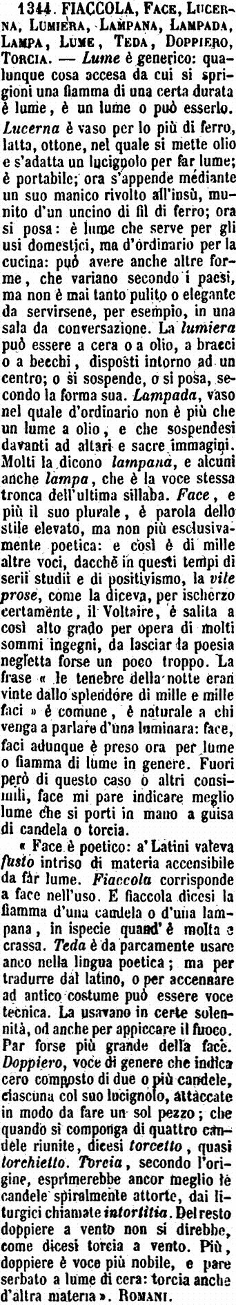 | Fiaccola, Face, Lucerna, Lumiera, Lampana, Lampada, Lampa, Lume, Teda, Doppiero, Torcia - Lume è generico: qualunque cosa accesa da cui si sprigioni una fiamma di una certa durata è lume, è un lume o può esserlo. Lucerna è vaso per lo più di ferro, latta, ottone, nel quale si mette olio e s'adatta un lucignolo per far lume; è portabile; ora s'appende mediante un suo manico rivolto all'insù, munito d'un uncino di fil di ferro; ora si posa: è lume che serve per gli usi domestici, ma d'ordinario per la cucina: può avere anche altre forme, che variano secondo i paesi, ma non è mai tanto pulito o elegante da servirsene, per esempio, in una sala da conversazione. La lumiera può essere a cera o a olio, a bracci o a becchi, disposti intorno ad un centro; o si sospende, o si posa, secondo la forma sua. Lampada, vaso nel quale d'ordinario non è più che un lume a olio, e che sospendesi davanti ad altari e sacre immagini. Molti la dicono lampana, e alcuni anche lampa, che è la voce stessa tronca dell'ultima sillaba. Face, e più il suo plurale, è parola dello stile elevato, ma non più esclusivamente poetica: e così è di mille altre voci, dacchè in questi tempi di serii studii e di positivismo, la vile prose, come la diceva, per ischerzo certamente, il Voltaire, è salita a così alto grado per opera di molti sommi ingegni, da lasciar la poesia negletta forse un poco troppo. La frase «le tenebre della notte eran vinte dallo splendore di mille e mille faci» è comune, è naturale a chi venga a parlare d'una luminara: face, faci adunque è preso ora per lume o fiamma di lume in genere. Fuori però di questo caso o altri consimili, face mi pare indicare meglio lume che si porti in mano a guisa di candela o torcia.
