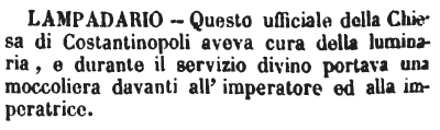 | Lampadario - Questo ufficiale della Chiesa di Costantinopoli aveva cura della luminaria, e durante il servizio divino portava una moccoliera davanti all'imperatore ed alla imperatrice. [immagine] |