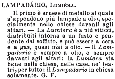| Lampadario, Lumiera - Il primo è arnese di metallo al quale s'appendono più lampade ad olio, specialmente nelle chiese davanti agli altari. - La Lumiera è a più viticci, distribuiti intorno a un fusto e pendente dal soffitto, e può essere a cera e a gas, quasi mai a olio. - Il Lampadario è sempre a olio, e sempre davanti agli altari: la Lumiera sta bene nelle chiese, nelle case, ne' teatri, per tutto: il Lampadario in chiesa solamente. G. F. [immagine] |