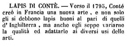 | Lapis di Contè - Verso il 1795, Conté creò in Francia una nuova arte, e non solo gli si debbono lapis buoni al pari di quelli d'Inghilterra, ma anche egli seppe variarne la qualità ed adattarle ai diversi usi delle arti. [immagine] |