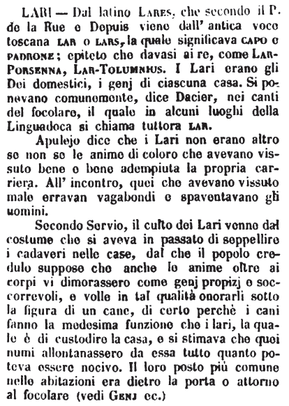 | Lari - Dal latino Lares, che secondo il P. de la Rue e Depuis viene dall'antica voce toscana lar o lars, la quale significava capo e padrone; epiteto che davasi ai re, come Lar-Porsenna, Lar-Tolumnius. I Lari erano gli Dei domestici, i genj di ciascuna casa. Si ponevano comunemente dice Dacier, nei canti del focolare, Il quale in alcuni luoghi della Linguadoca si chiama tuttora lar.