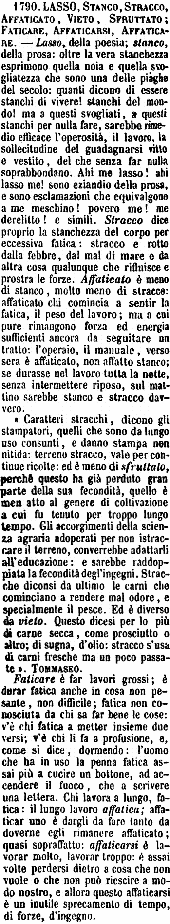 Faticare è far lavori grossi; è durar fatica anche in cosa non pesante, non difficile; fatica non conosciuta da chi sa far bene le cose: v'è chi fatica a metter insieme due versi; v'è chi li fa a profusione, e, come si dice, dormendo: l'uomo che ha in uso la penna fatica assai più a cucire un bottone, ad accendere il fuoco, che a scrivere una lettera. Chi lavora a lungo, fatica: il lungo lavoro affatica; affaticar uno è dargli da fare tanto da doverne egli rimanere affaticato; quasi sopraffatto: affaticarsi è lavorar molto, lavorar troppo: è assai volte perdersi dietro a cosa che non vuole o che non può riescire a modo nostro, e allora questo affaticarsi è un inutile sprecamento di tempo, di forze, d'ingegno. [immagine] |