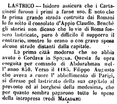 Lastrico - Isidoro assicura che i Cartaginesi furono i primi a farne uso. E' noto che la prima grande strada costruita dai Romani lo fu sotto il consolato d'Appio Claudio. Benchè gli storici non dicano che le vie di Roma fossero lastricate, pure è difficile il supporre il contrario, mentre lo erano e con grave spesa alcune strade distanti dalla capitale.