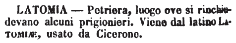 Latomia - S. f. Gr. Λατομία. (Arche.) [Fab.] Voc. greco-sicula. Aureo lat. = Cava di pietre. E dicesi propriamente di quelle di Siracusa, in cui dagli antichi formossi una prigione. Segner. Pred 14. 7. (M.) Minor di questo furono riputate le latomle di Siracusa, e le carceri d'Agrigento. Targ. Tozz. G. Viagg. 1. 17. (Gh.) Nella quale (pendice) sono molte utilissime latomíe,… E Prodr. 23. Le vedute di diverse latomíe, cioè cave di pietre,…