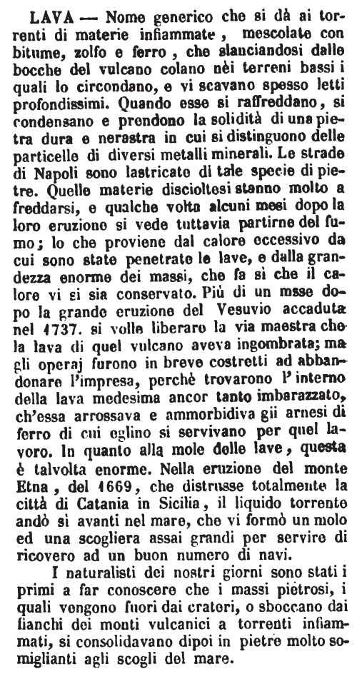 I naturalisti dei nostri giorni sono stati i primi a far conoscere che i massi pietrosi, i quali vengono fuori dai crateri, o sboccano dai fianchi dei monti vulcanici a torrenti infiammati, si consolidavano dipoi in pietre molto somiglianti agli scogli del mare. [immagine] |