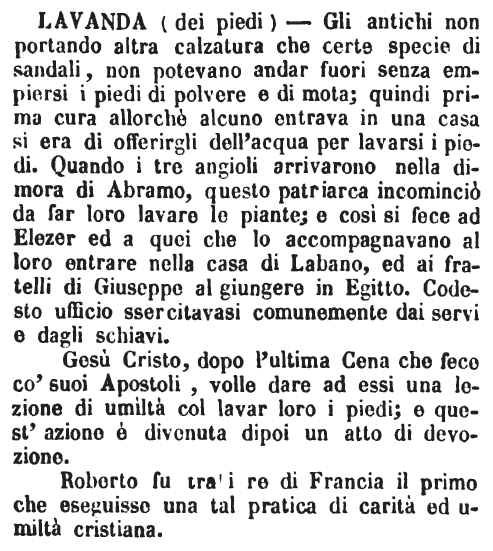 | Lavanda (dei piedi) - Gli antichi non portando altra calzatura che certe specie di sandali, non potevano andar fuori senza empiersi i piedi di polvere e di mota; quindi prima cura allorchè alcuno entrava in una casa si era di offerirgli dell'acqua per lavarsi i piedi. Quando i tre angioli arrivarono nella dimora di Abramo, questo patriarca incominciò da far loro lavare le piante; e così si fece ad Elezer ed a quei che lo accompagnavano al loro entrare nella casa di Labano, ed ai fratelli di Giuseppe al giungere in Egitto. Codesto ufficio ssercitavasi comunemente dai servi e dagli schiavi.