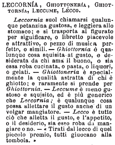 | Leccornia, Ghiottoneria, Ghiottornia, Leccume, Lecco - Leccornia suol chiamarsi qualunque petanzina gustosa, e leggiera allo stomaco; e si trasporta al figurato per significare, o libretto piacevole e attrattivo, o pezzo di musica perfetto, o simili. - Ghiottornia è qualunque cosa squisita al gusto, e desiderata da chi ama il buono, o sia essa roba cucinata, o pasta, o liquori, o gelati. - Ghiottoneria è specialmente la qualità astratta di chi è ghiotto; e raramente si prende per Ghiottornia. - Leccume è meno gustoso e squisito, ed è più generico che Leccornia; è qualunque cosa possa allettare il gusto anche di un volgar mangiatore. - Lecco è tutto ciò che alletta il gusto, e l'appetito, o il desiderio, sia esso roba da mangiare o no. - «Tirati dal lecco di quel piccolo premio, tutti giuocano alla tombola.» [immagine] |
