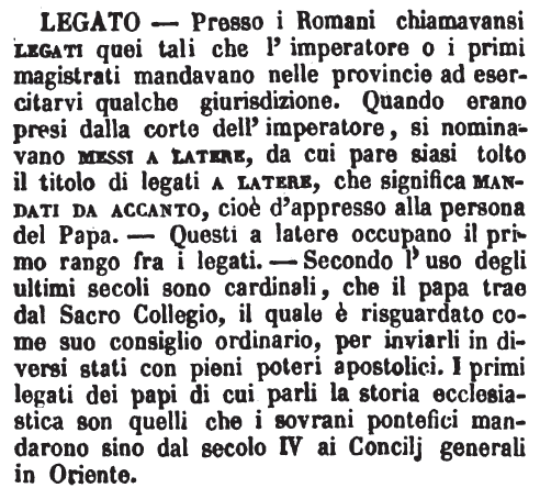 | Legato - Presso i Romani chiamavansi legati quei tali che l'imperatore o i primi magistrati mandavano nelle provincie ad esercitarvi qualche giurisdizione. Quando erano presi dalla corte dell'imperatore, si nominavano messi a latere, da cui pare siasi tolto il titolo di legati a latere, che significa mandati da accanto, cioè d'appresso alla persona del Papa. - Questi a latere occupano il primo rango fra i legati. - Secondo l'uso degli ultimi secoli sono cardinali, che il papa trae dal Sacro Collegio, il quale è risguardato come suo consiglio ordinario, per inviarli in diversi stati con pieni poteri apostolici. I primi legati dei papi di cui parli la storia ecclesiastica son quelli che i sovrani pontefici mandarono sino dal secolo IV ai Concilj generali in Oriente. [immagine] |