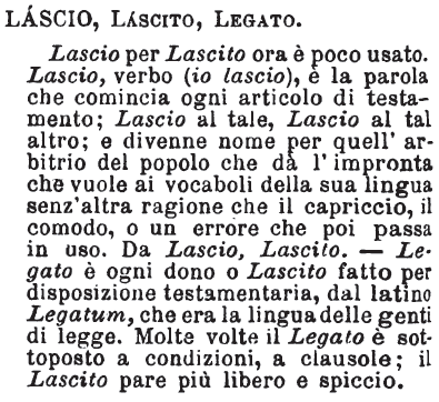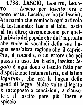 | Lascio, Lascito, Legato - Lascio per Lascito ora è poco usato. Lascio, verbo (io lascio), è la parola che comincia ogni articolo di testamento; Lascio al tale, Lascio al tal altro; e divenne nome per quell'arbitrio del popolo che dà l'impronta che vuole ai vocaboli della sua lingua senz'altra ragione che il capriccio, il comodo, o un errore che poi passa in uso. Da Lascio, Lascito. - Legato è ogni dono o Lascito fatto per disposizione testamentaria, dal latino Legatum, che era la lingua delle genti di legge. Molte volte il Legato è sottoposto a condizioni, a clausole; il Lascito pare più libero e spiccio. [immagine] |